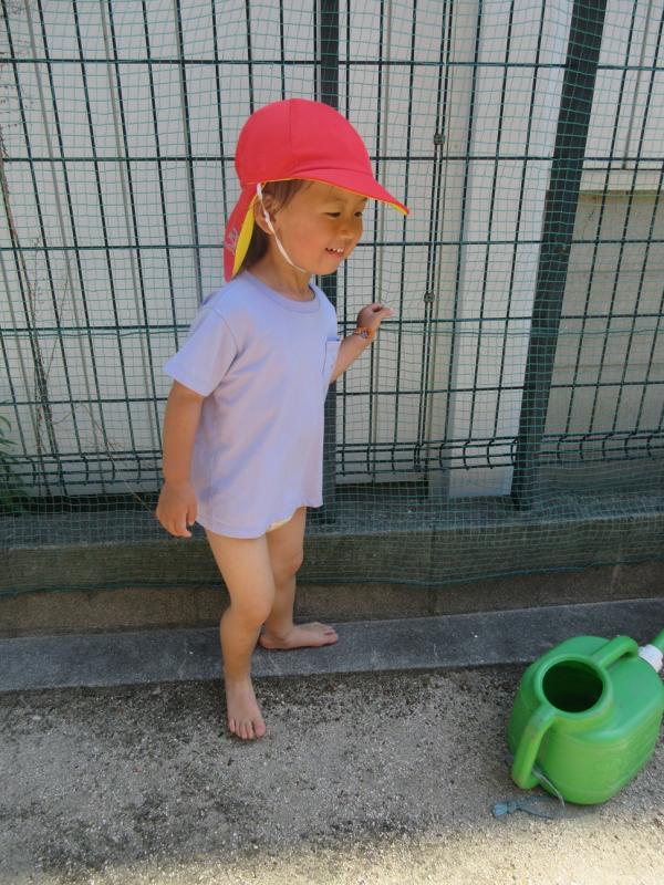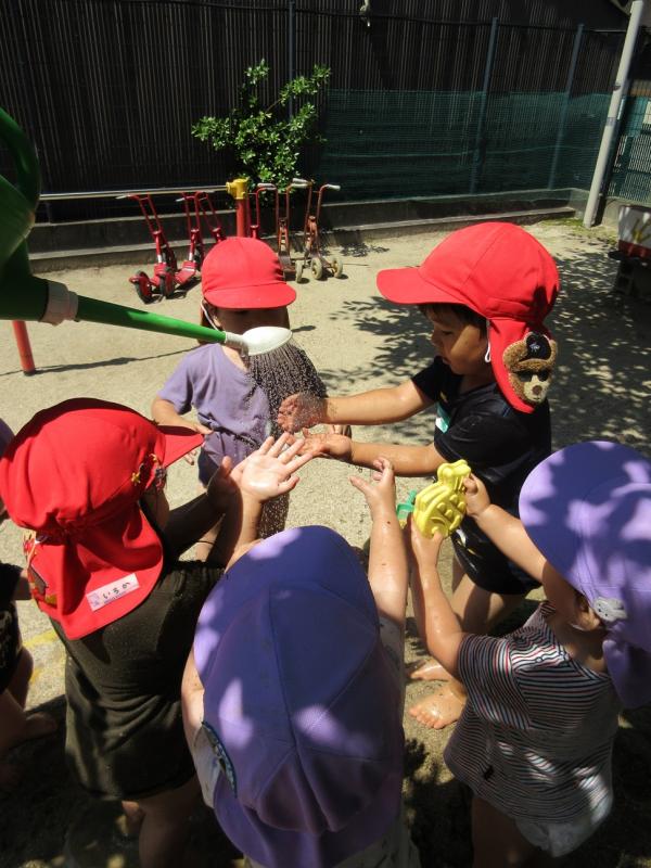 水がかかると「キャーつめたい」「気持ちいいね」「もっとして~」と大はしゃぎの子どもたち。