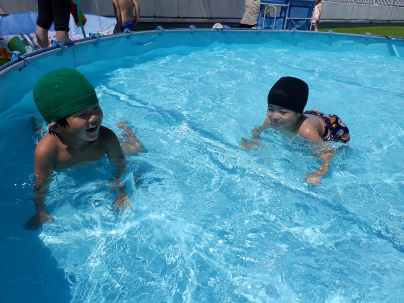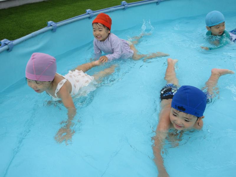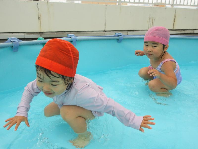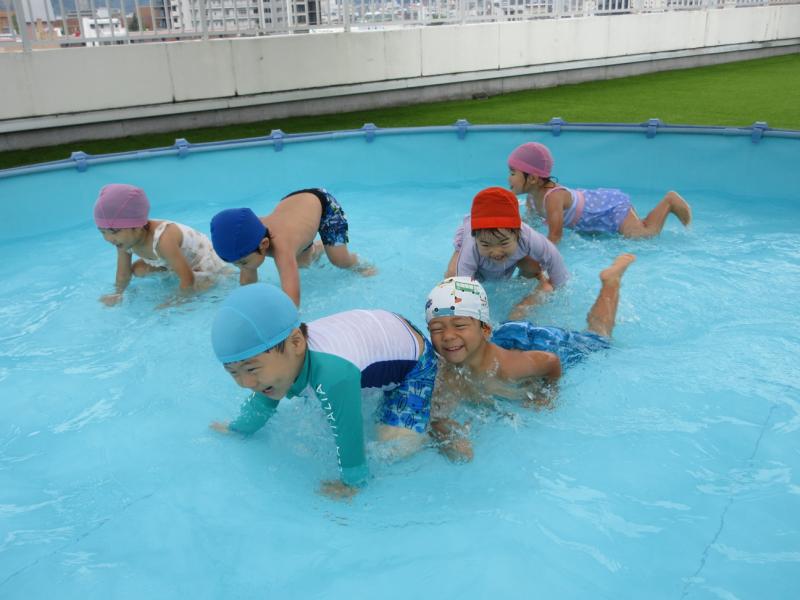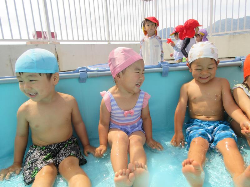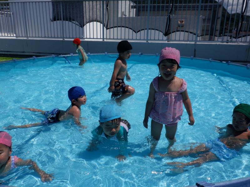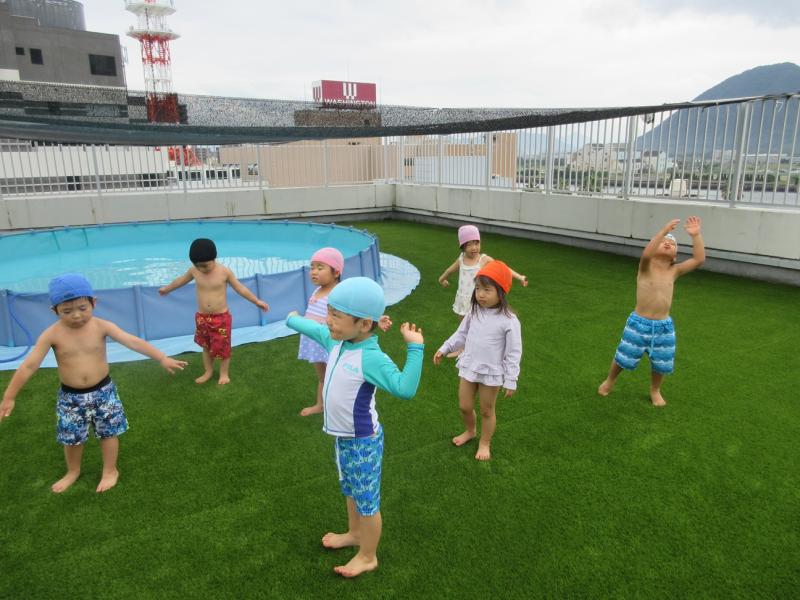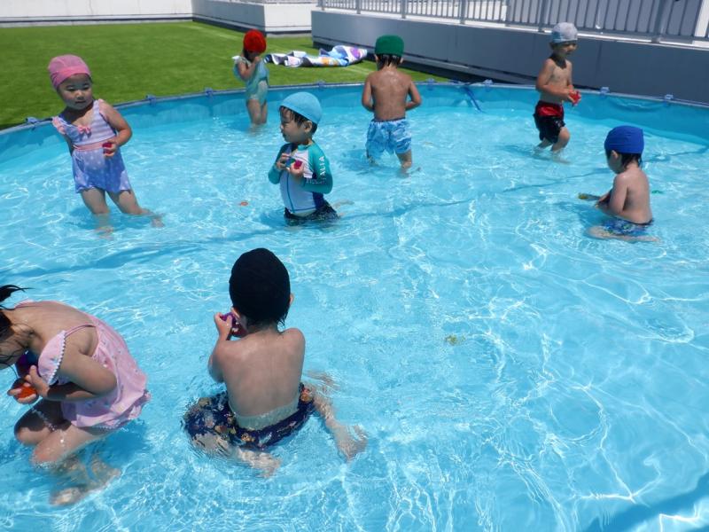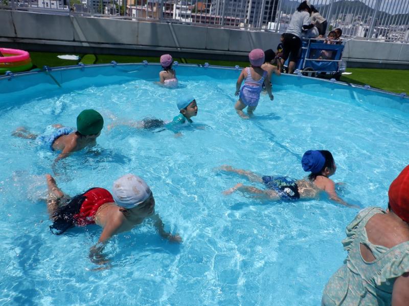 7月に入り天気の良い日は、屋上に上がりプールあそびを楽しんでいます。