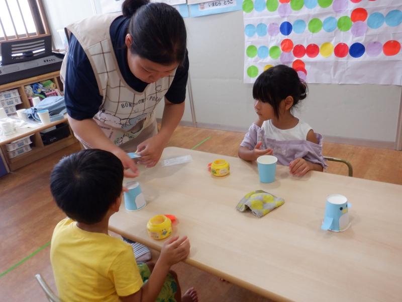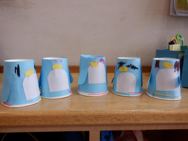 紙コップに水色の画用紙を貼ったり、黄色のくちばしを貼り可愛いペンギンができました。