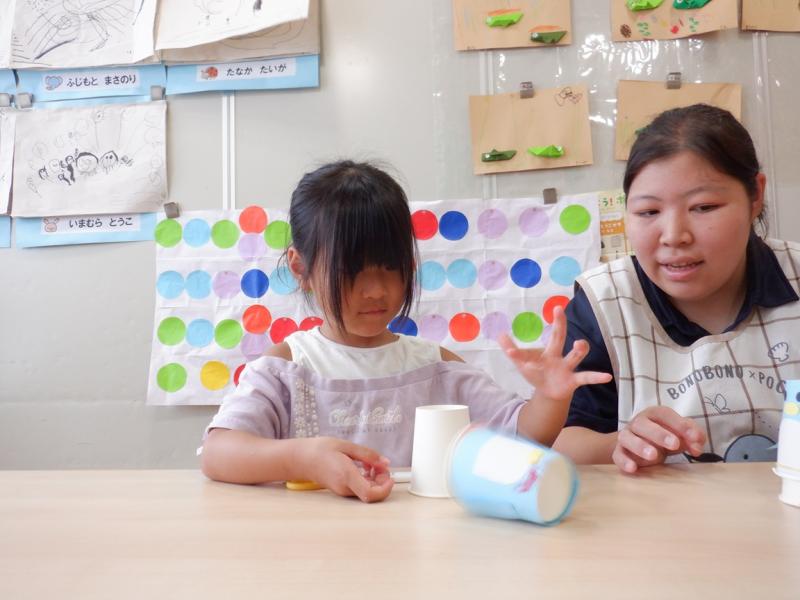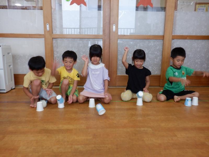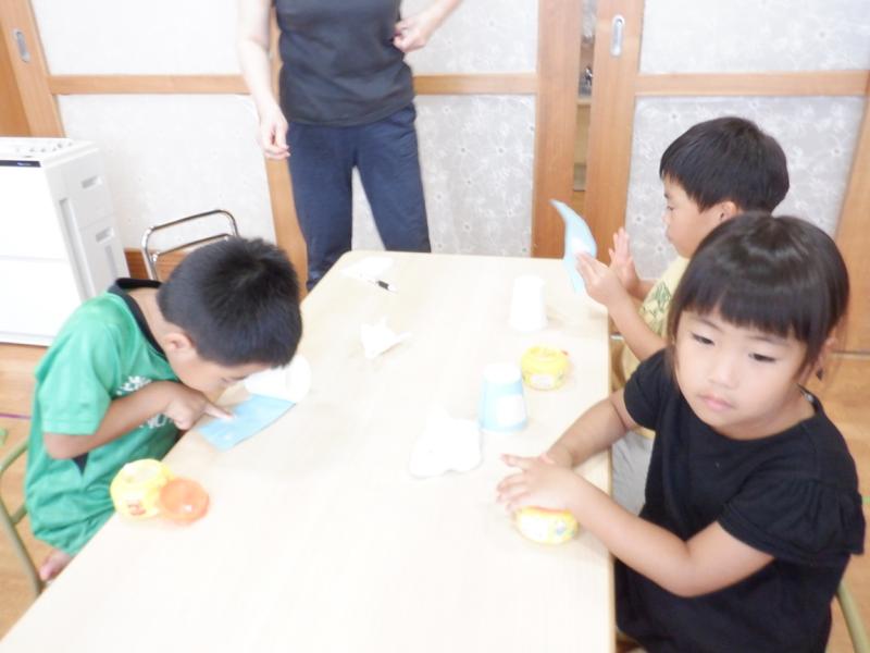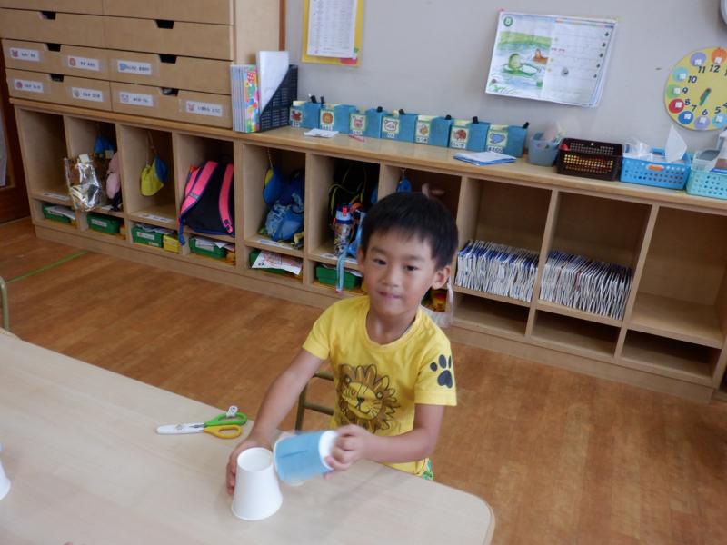 紙コップに切り込みを入れてゴムをつけて飛ばせるようになり、作った後飛ばしてみんなで遊び、