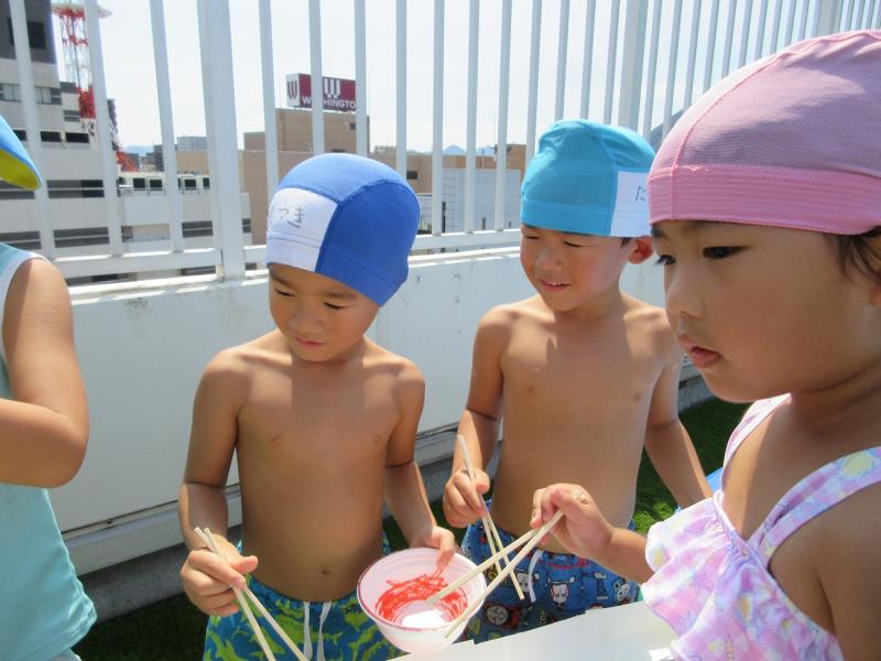 器と割り箸を持ち、毛糸をそうめんに見立て流れてくるそうめんを箸でつかみ楽しみました。
