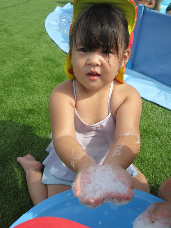 手ですくったり頭にのせたり泡の感触を味わいました。