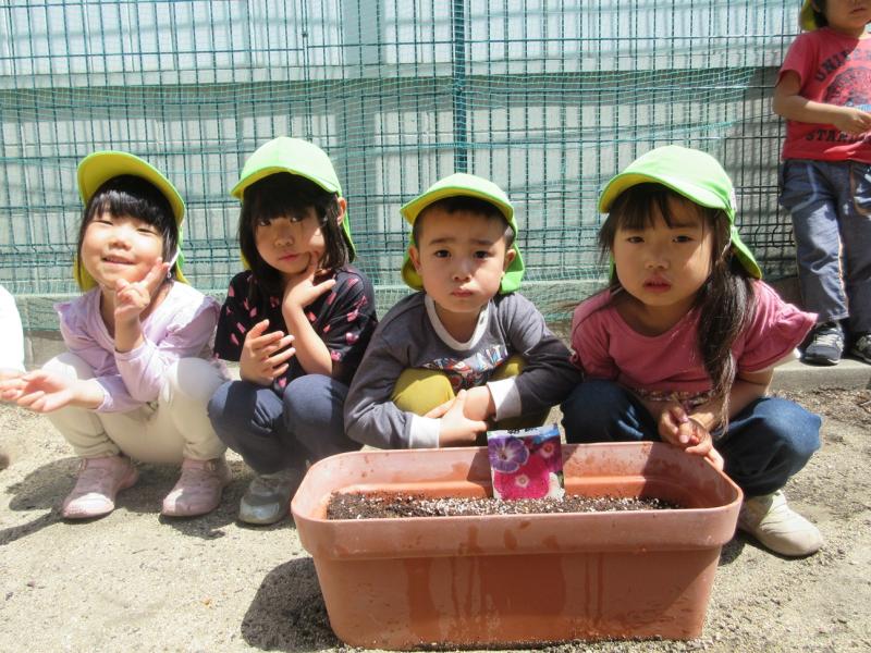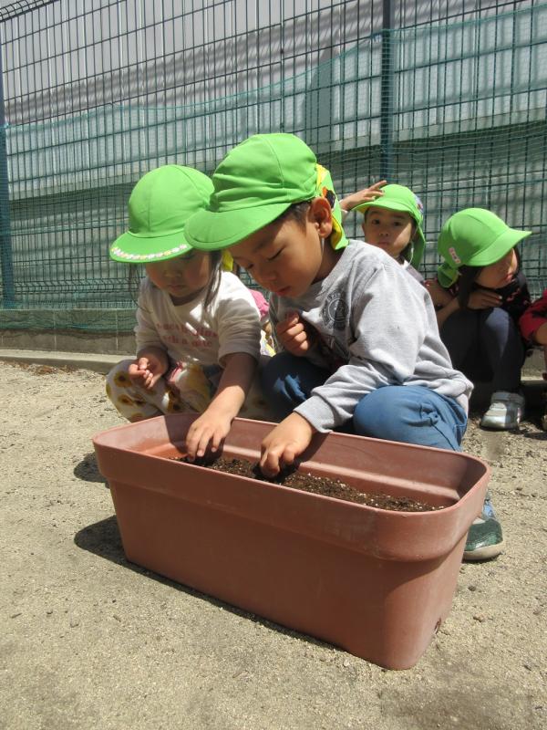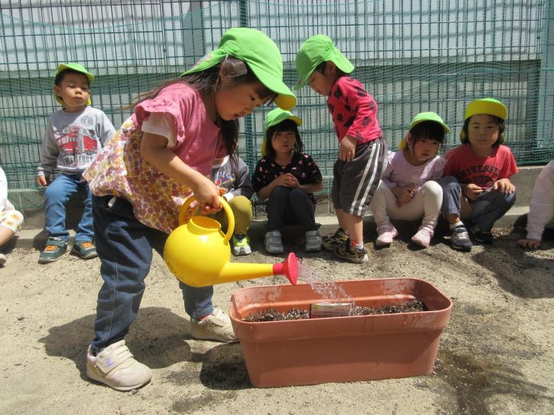 プランターに1人1粒ずつ種をまき水やりをしました。