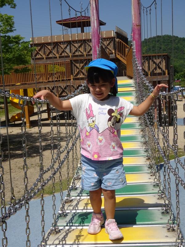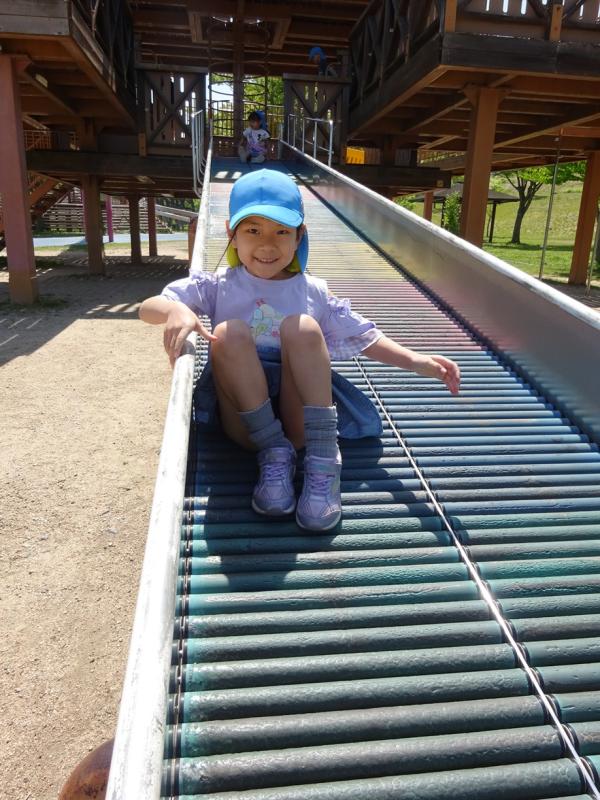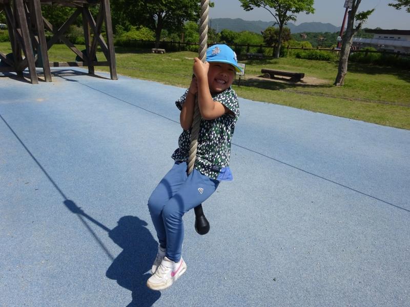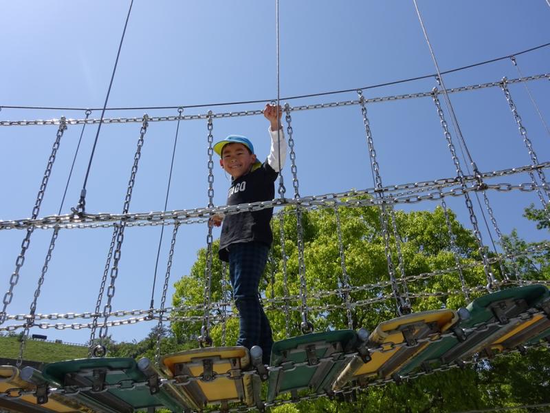 ロープ登りをしたり、ピラミッドの遊具を登ったりローラー滑り台をしたりと