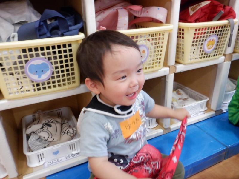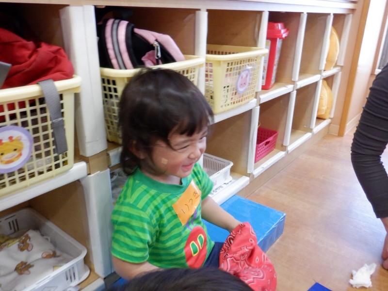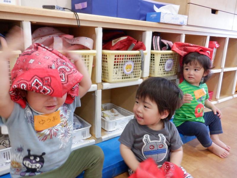 布遊びでは、「いない、いない、ばぁ」や、頭に乗せたりしました。