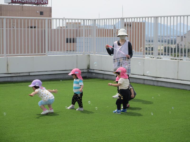 ジュースやお菓子をみんなで食べた後は、シャボン玉やバルーンを使って