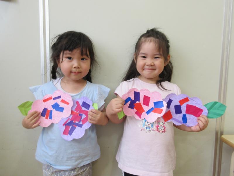 はさみ・のりを使って「アジサイ」の製作をしました。