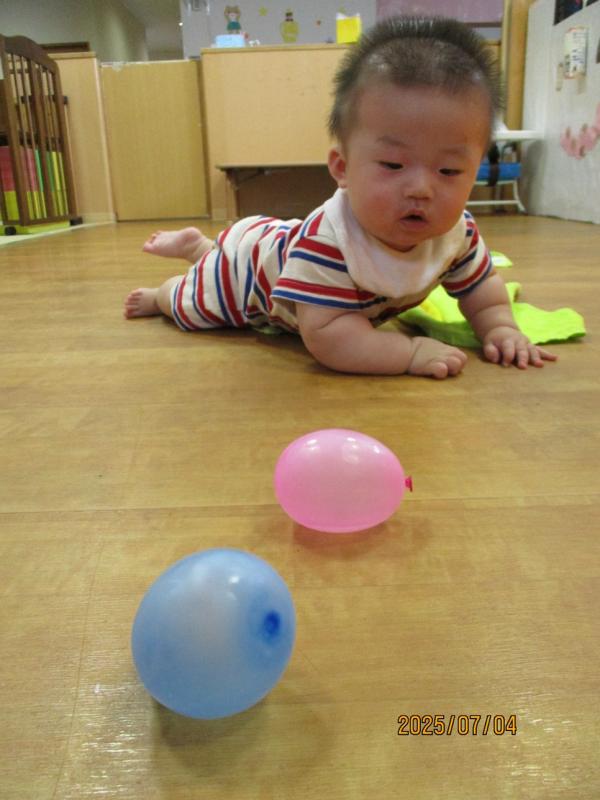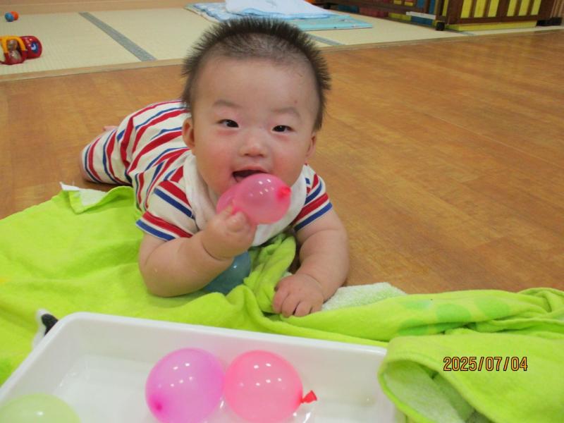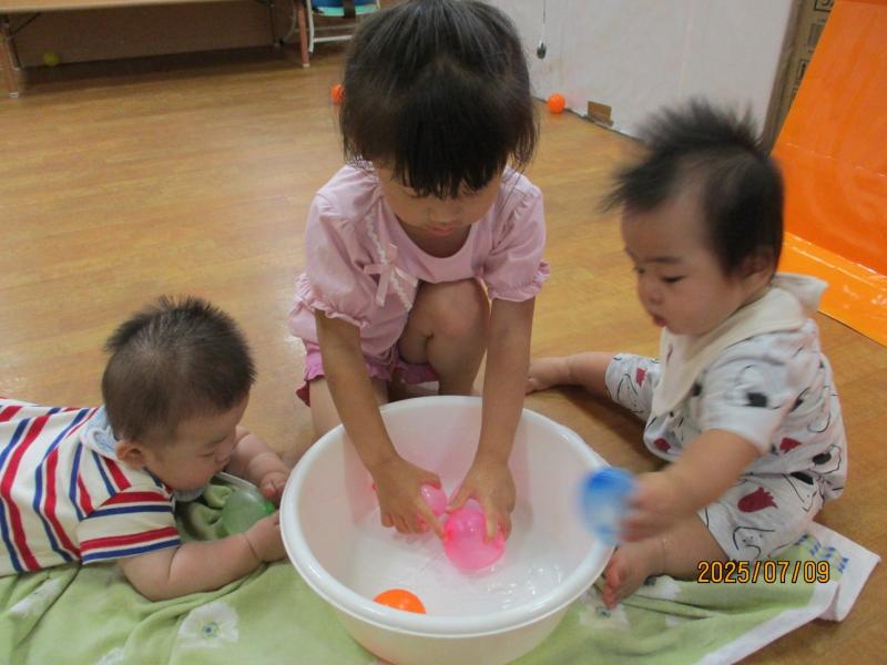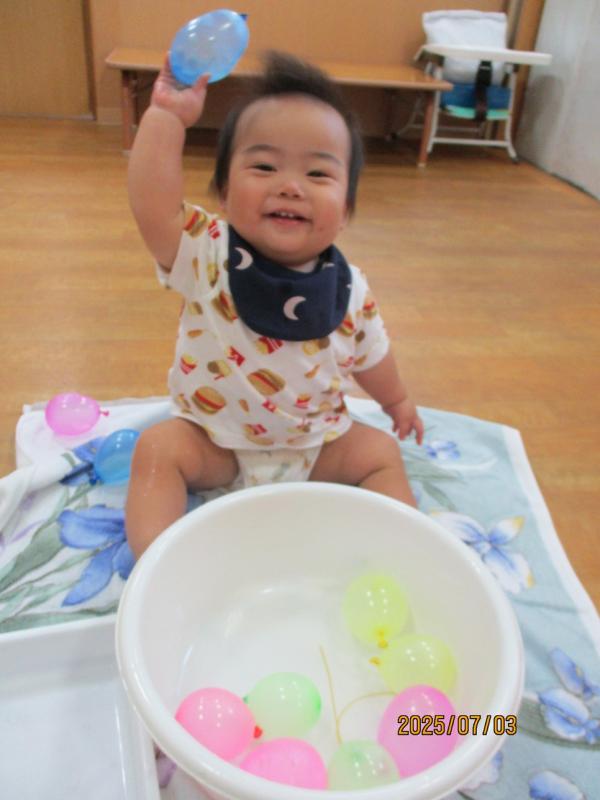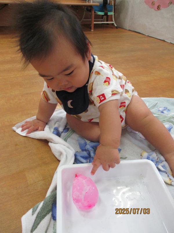 すごく興味をもって水風船を手に取り投げたり、もみもみしたりして遊びました。