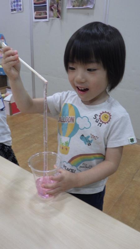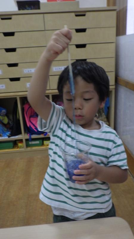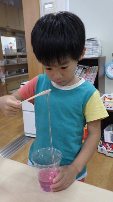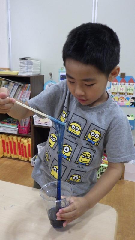 絵の具と食紅で色のつき方の違いを楽しんだり、液体からほう砂水を入れることで少しずつ