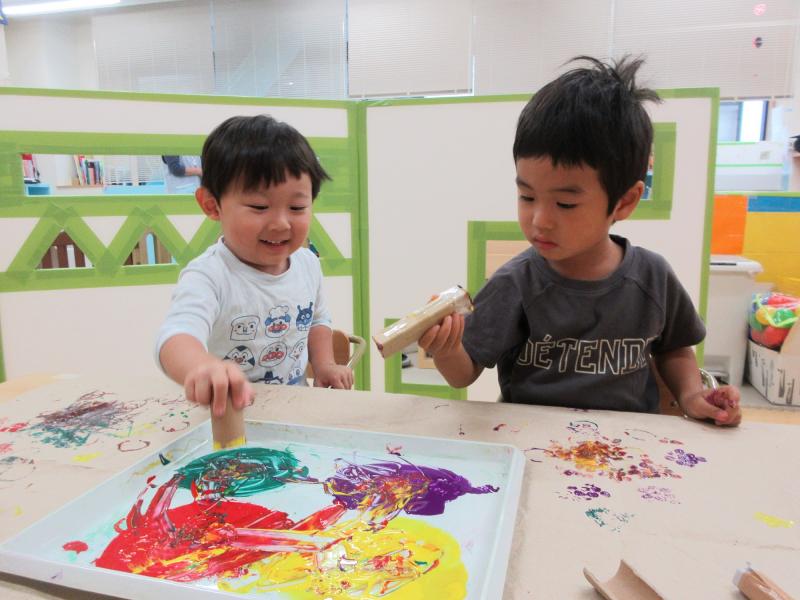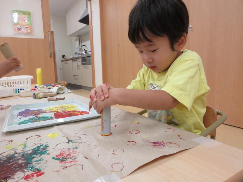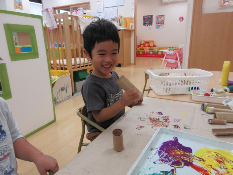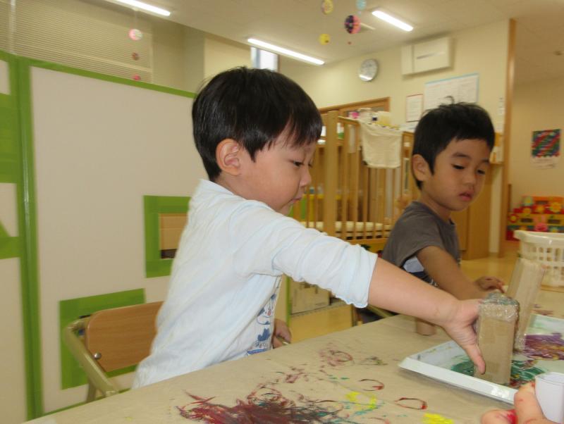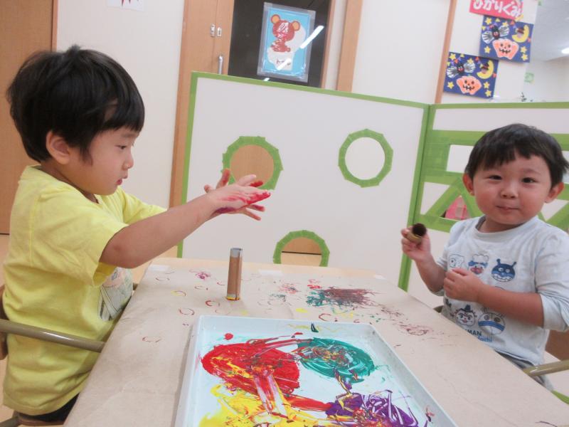 秋をイメージして、落ち葉色でスタンプあそびをしました。