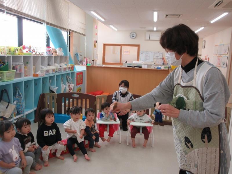 11月のお誕生日会のお楽しみは、「おおきなかぶ」のエプロンシアターでした。