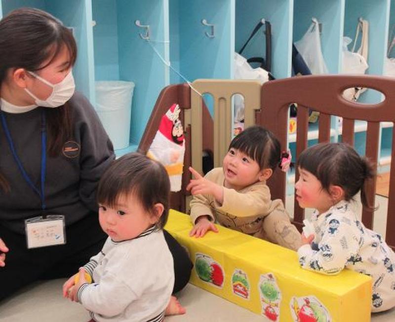 今年度、駅前近隣施設の有効利用として、ラフラフに遊びに行かせてもらうことがよくありました。そんな中ラフラフから「おでかけ児童館」というのがありますよ。とお誘いを頂き、さんさんぽーと保育園に、ラフラフティーンズボランティアのお姉さんたちが遊びに来てくれました。