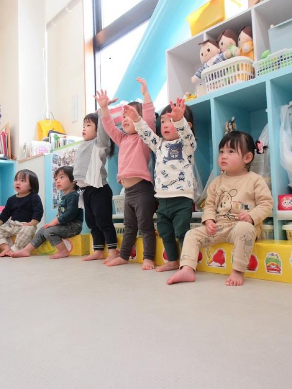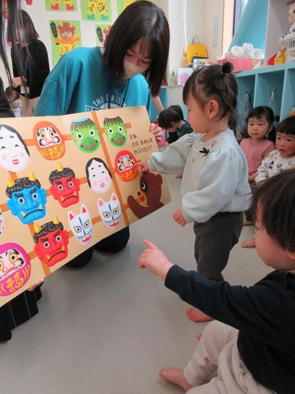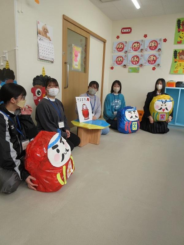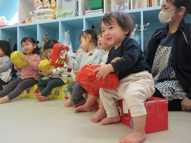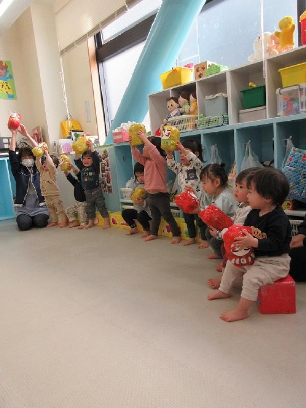 手袋シアターや大型絵本を読んでもらい、「ラフラフだるま」も登場。そしてだるまのプレゼントももらい、みんなの大好きな「だるまさんが」も楽しみ大喜びでした。