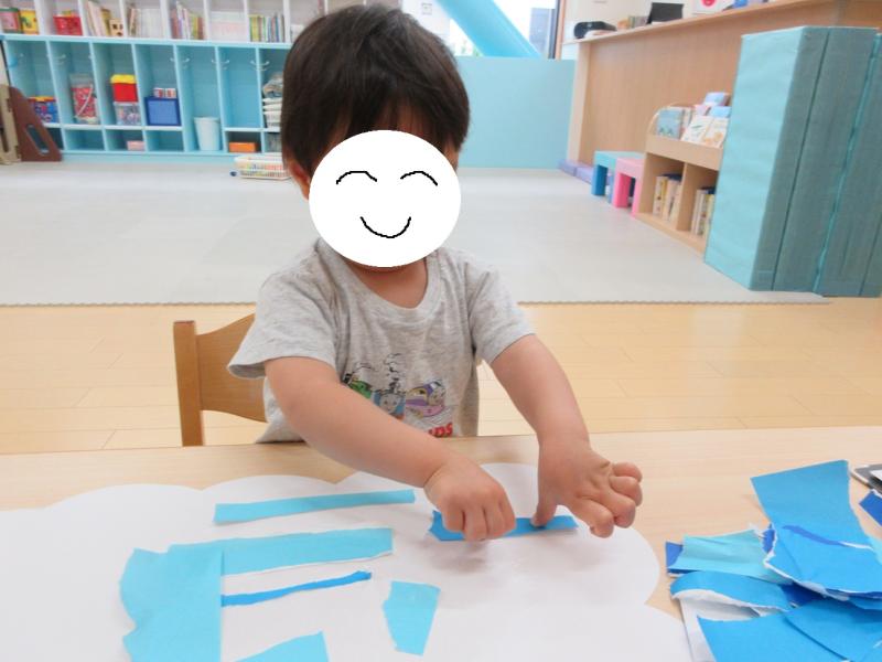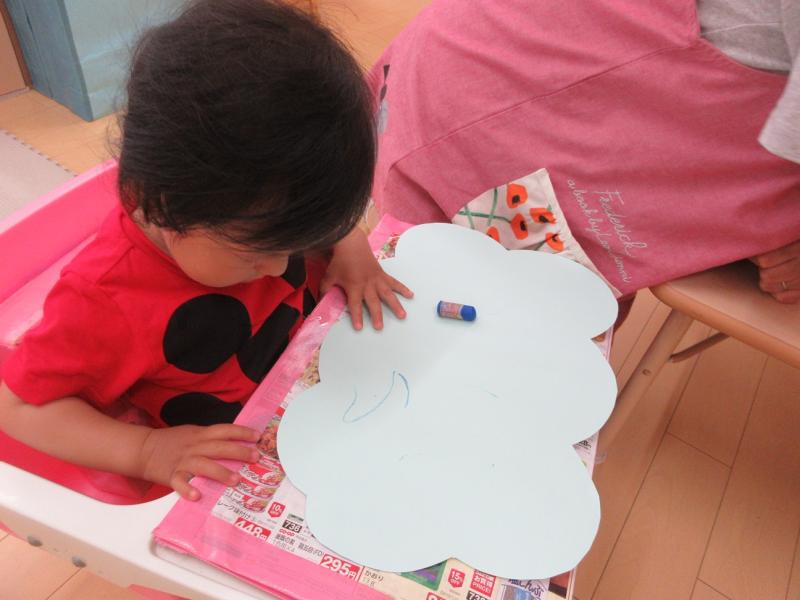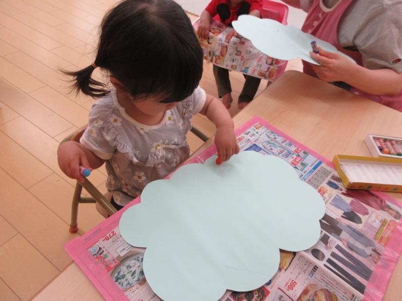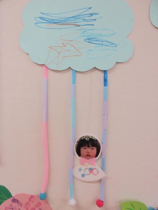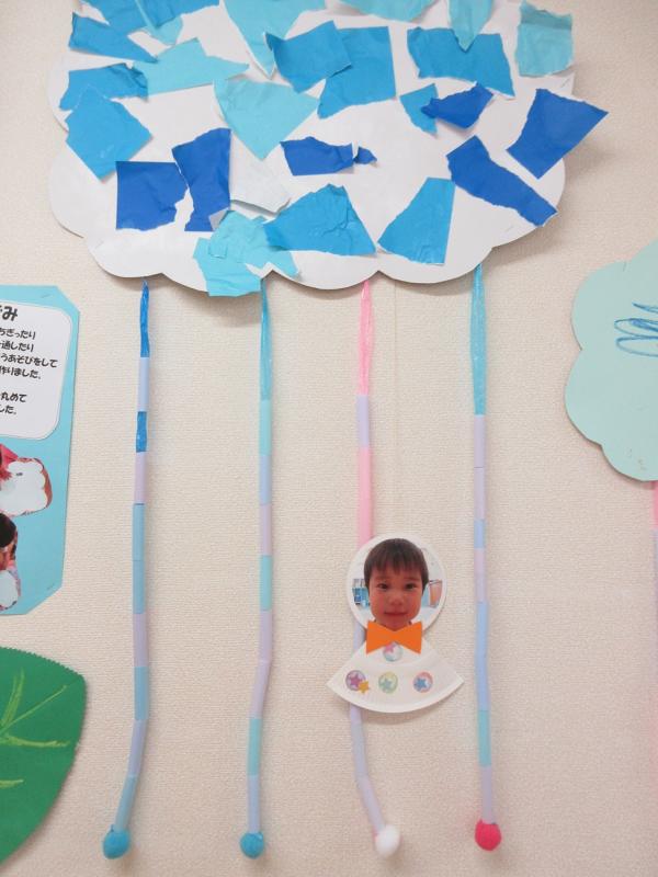 ちぎった折り紙は雲に貼ってストローのひも通しは何本も作って雨にしました。