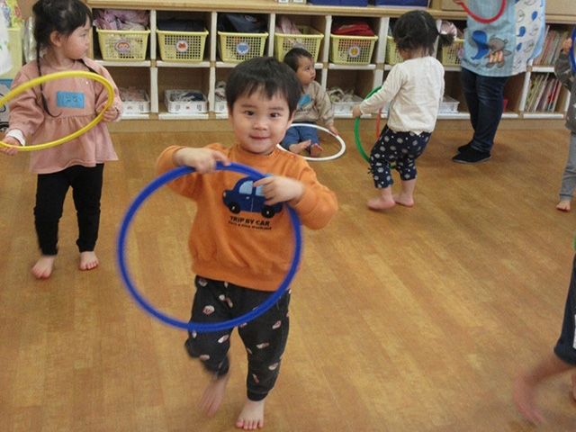 ● リトミック…♪に合せて楽しく体を動かすことで、聞く力や見る力、思考力や集中力を育み、自分で考えて行動できるように促します。専門講師による指導を行います。(1.2歳児は月に1回、3.4.5歳児は月に2回実施)