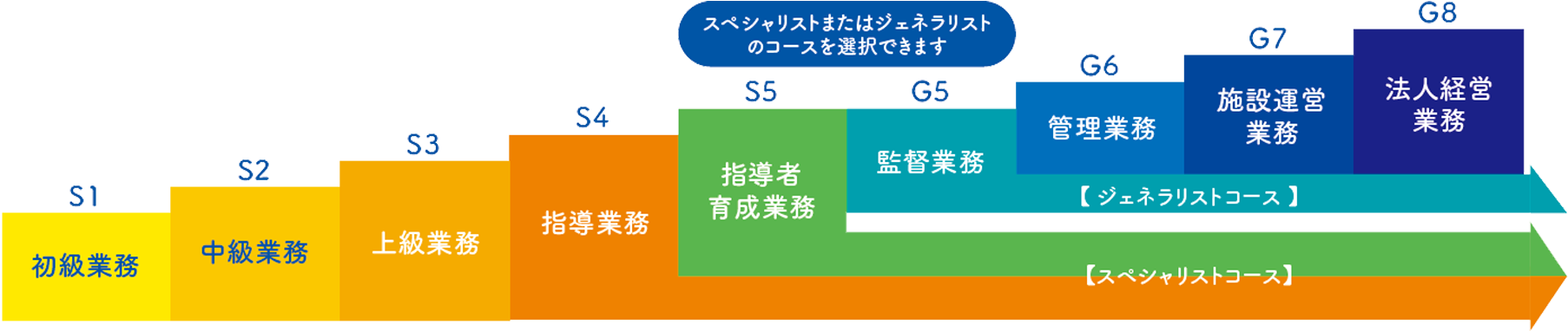 現場リーダーや事業所管理者を経て、スペシャリスト/ジェネラリストの各コースを選択できます。